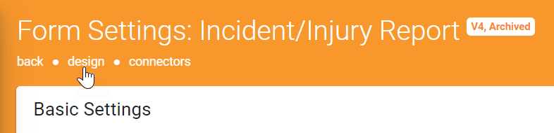 By selecting an archived, published, or draft version of the form, the context of the Settings page will change to that version.