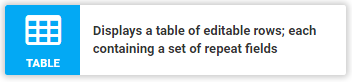 Displays a table of rows, with each row containing the same repeated set of fields. Users can then add/edit rows by tapping through into a page of the row fields.