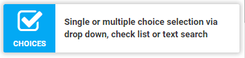 Allows you to specify a list of choices for the user to answer from. You can specify whether a Choices question permits only one answer or multiple answers. Choices questions can also use Data Sources for their options – Data Sources are a powerful feature that allows you to maintain answer lists centrally and share these lists between multiple Forms.