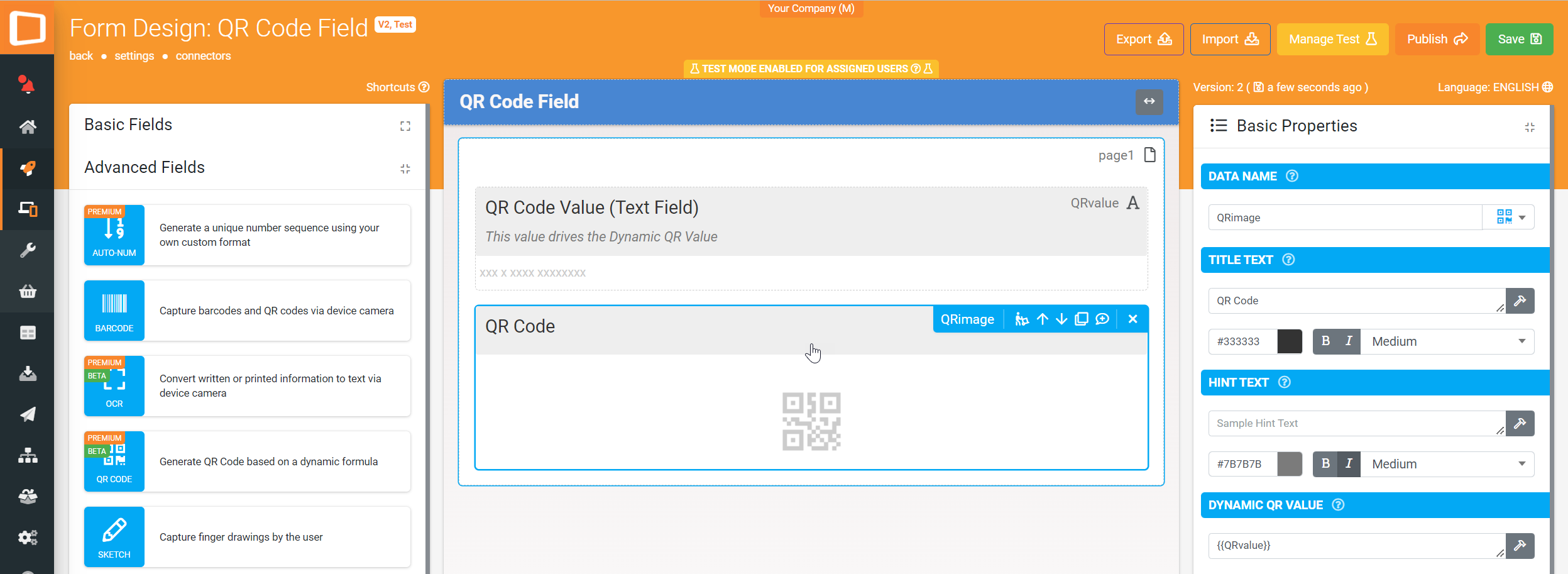 | Dynamic QR Value | Specify a static value or a formula that defines the value that will be embedded in the QR Code. |