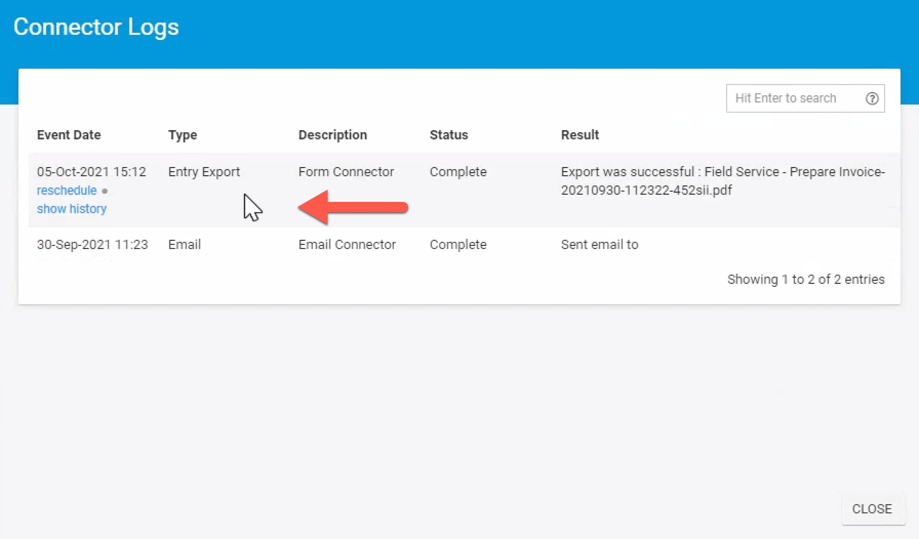 Connectors log their activity when they run. To view the logs, choose the Connector Logs link from the record's card. The Connector Logs pane will open and includes several options: