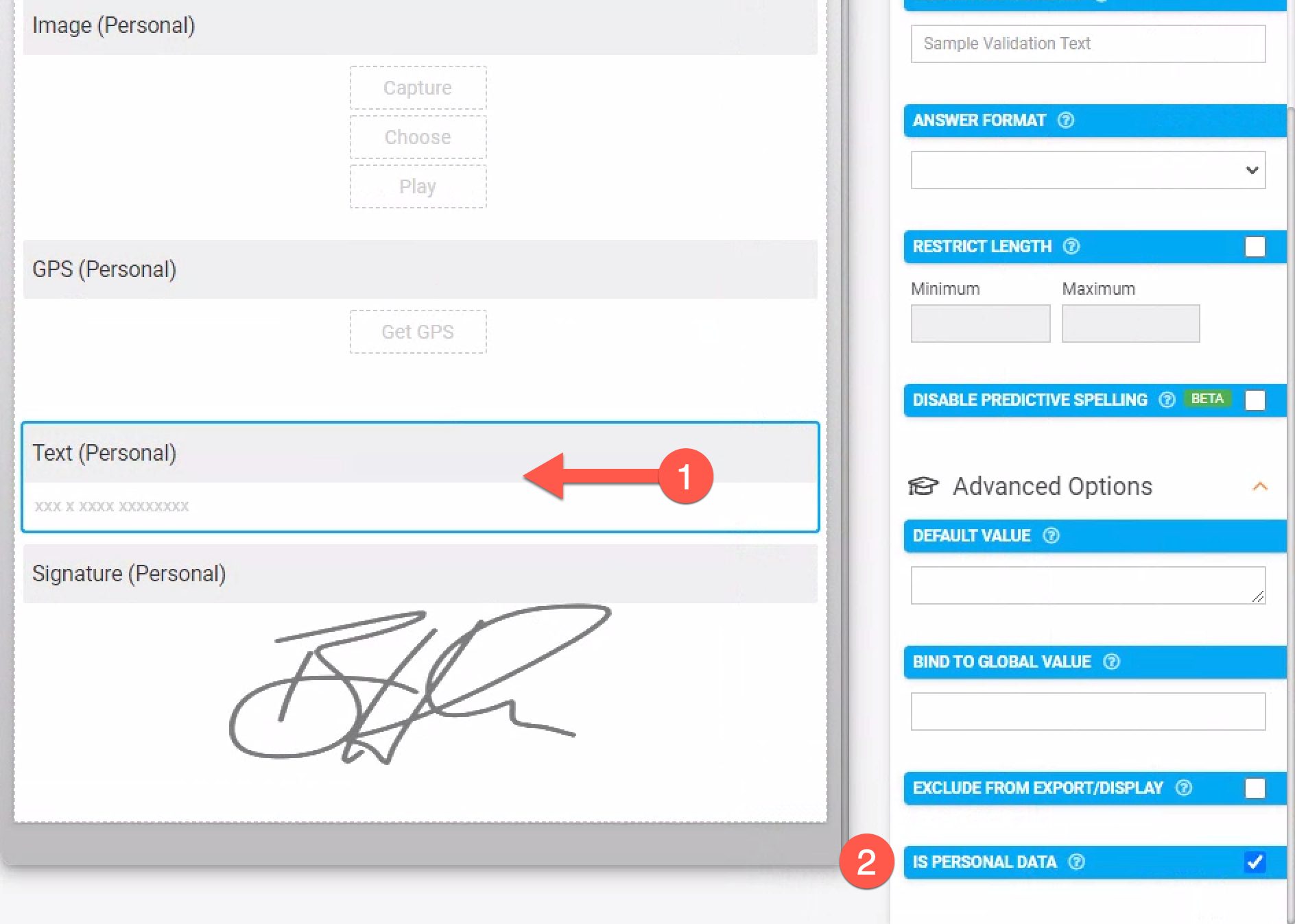 By itself, setting this flag does not grant or imply additional security, protection, and privacy of data. Data is still captured and uploaded to the Platform and without additional settings made within your forms and/or Connectors, can be exported.To flag a field as Is Personal Data:
