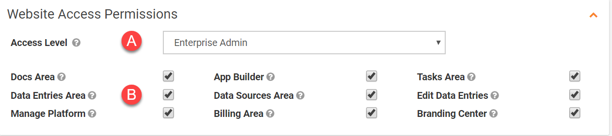 - Select the areas of the website that the User can access. Unchecking the box for an area will remove the item from the left-hand side navigation menu.
