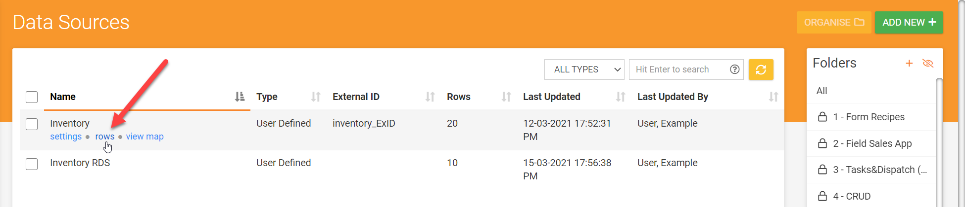 This functionality is accessed via the Rows page of a Data Source on the secure website. By Navigating to the left-side menu area Connected Data>Data Sources and click on the "Rows" option available when hovering over a data source.