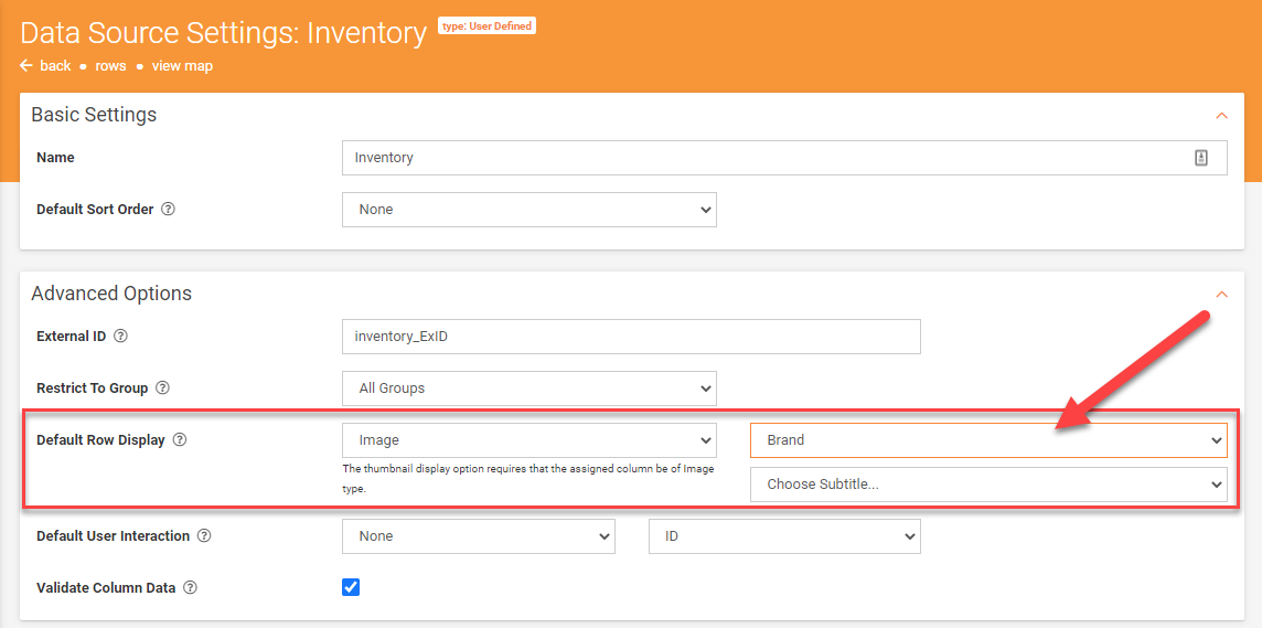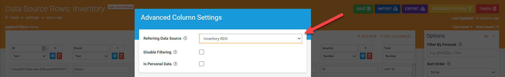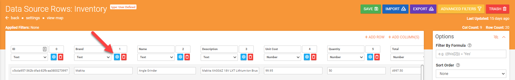 Once you're on the Rows page of a Data Source, simply click on the “cog” icon seen next to each column heading to open the Advanced Column Settings.