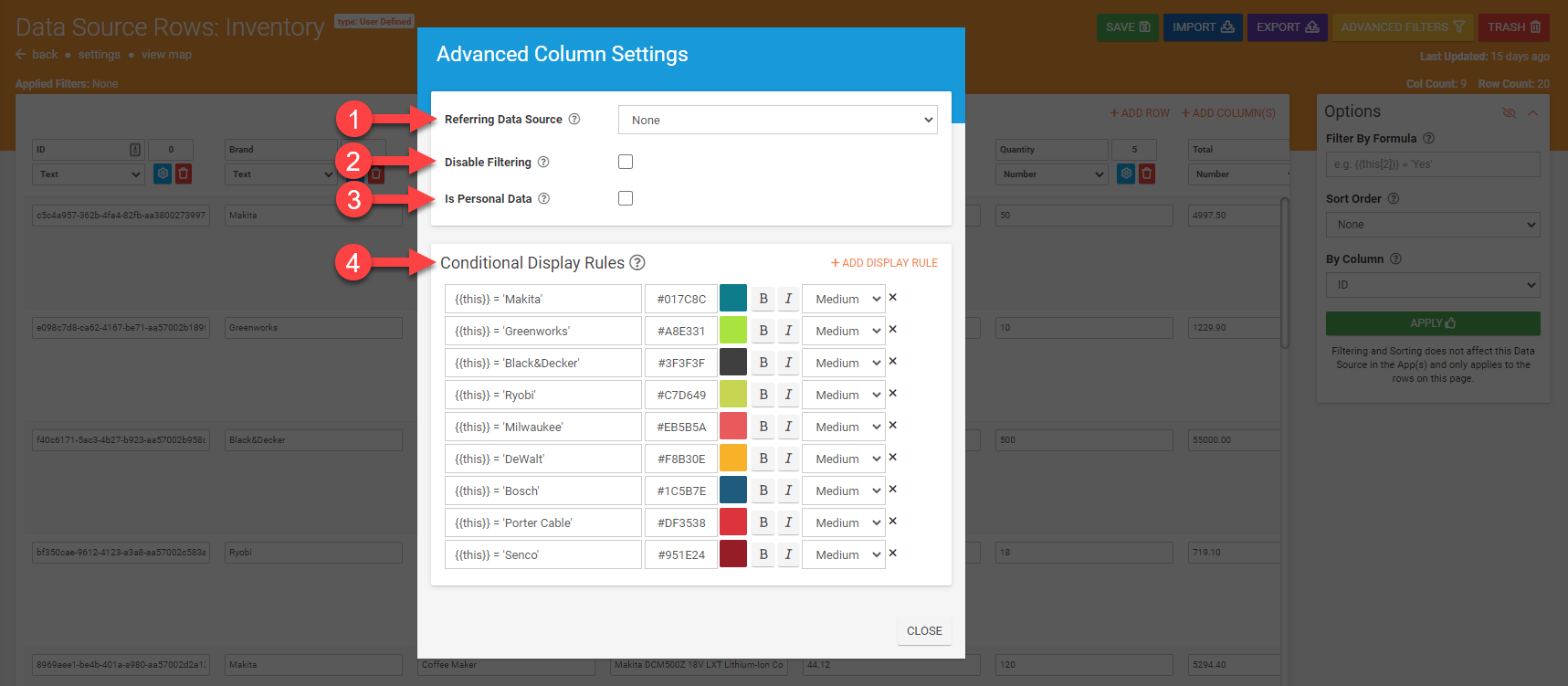To help control how the Data Source filters and rows display across your apps, our platform provides advanced column configuration functionality.