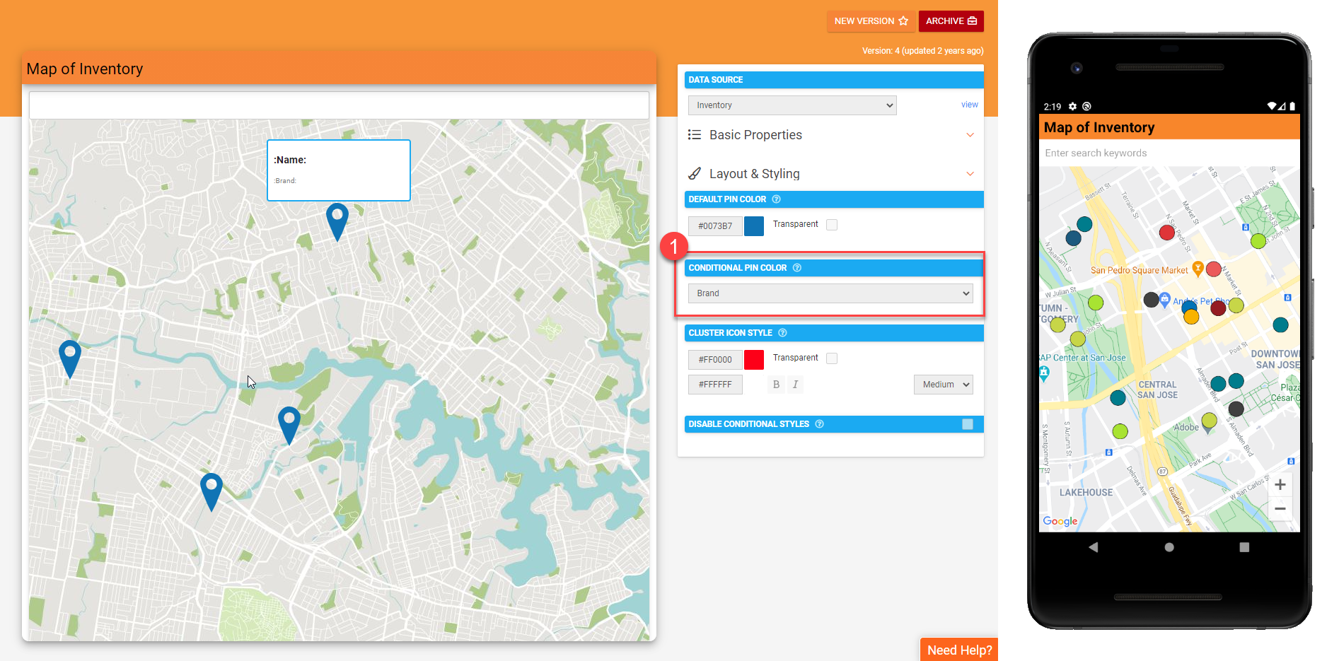 Colors the map pins displayed, provided you have set your rules column as the Conditional Pin Color property in the Mapping screen designer.